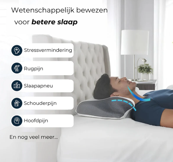 Het Snoozy Relief Pillow is speciaal ontworpen voor optimale ondersteuning en comfort, met gerichte verlichting bij nekpijn en stijfheid.